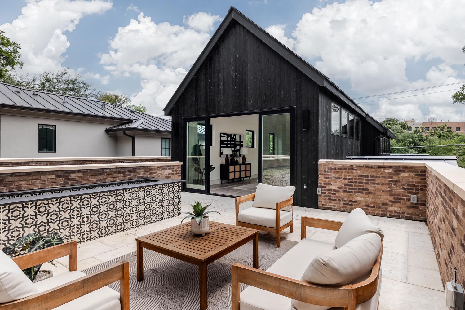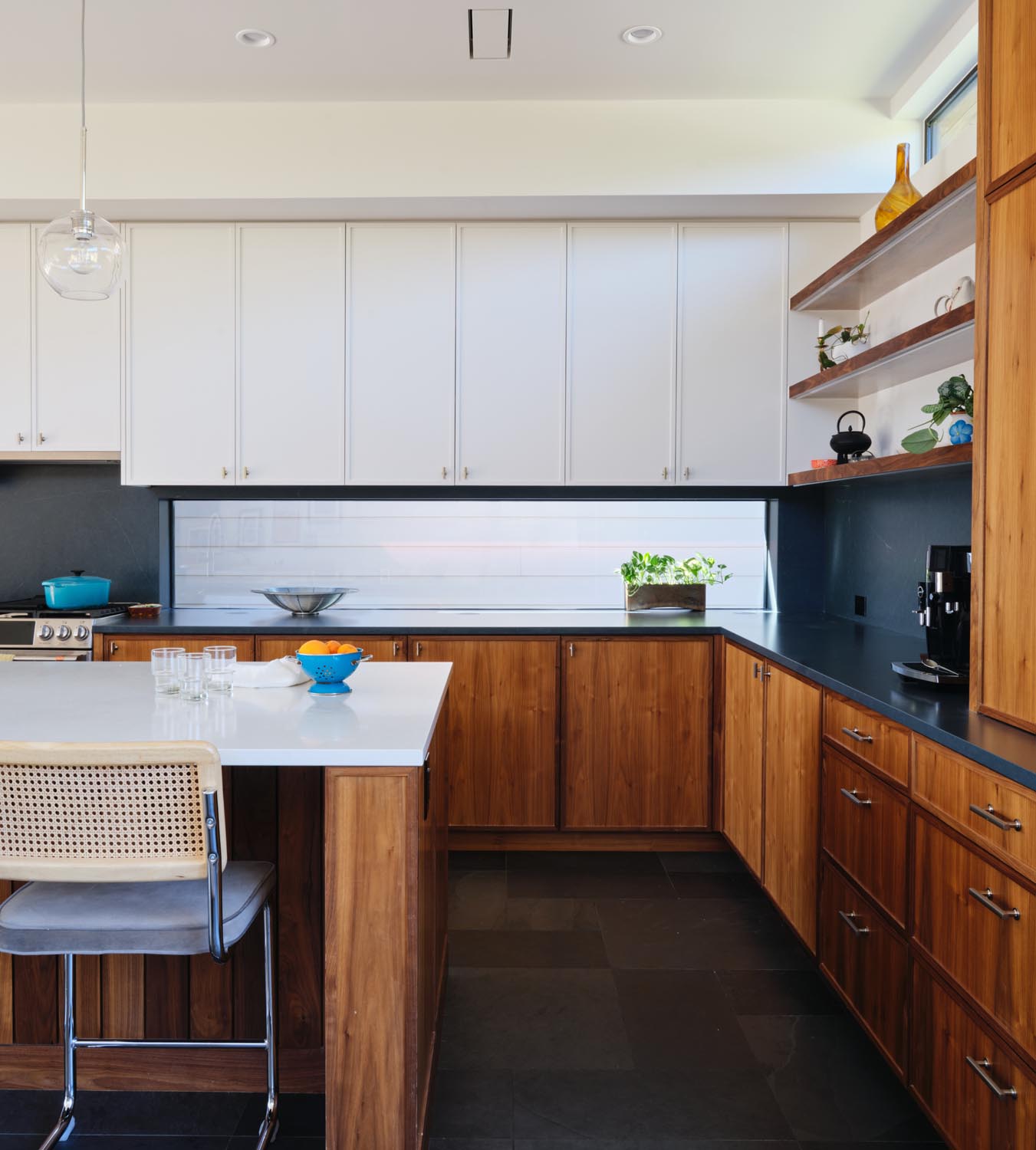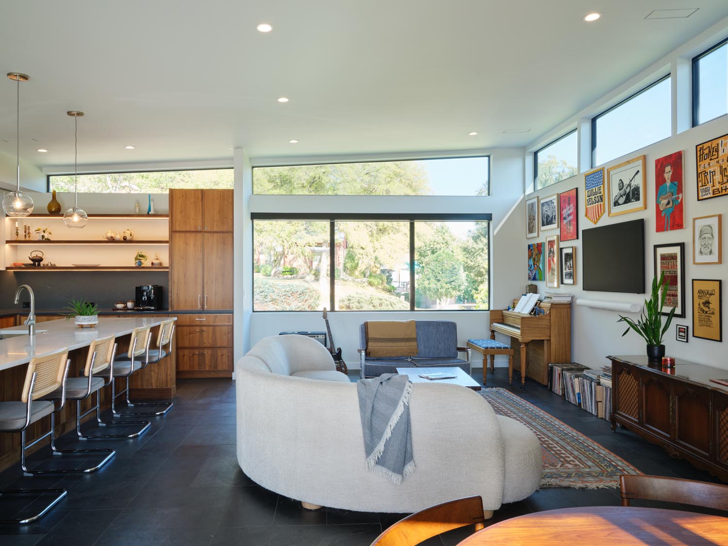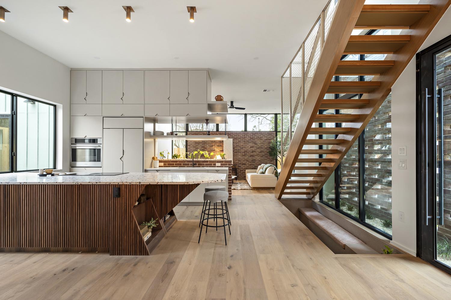 This eclectic home designed by Davey McEathron Architecture with interiors + construction by Cary Paul Studios is completely unique and custom. Step into a true architectural gem – this new construction home in the heart of Zilker blends mid-century modern charm with 70s and Memphis modern influenced interiors. Inside, you’ll find a sunken conversation pit, perfect for intimate gatherings, alongside a walnut-clad and terrazzo topped mid-century kitchen peninsula accented by mod floating shelves and warm brick details with a retro planter box.