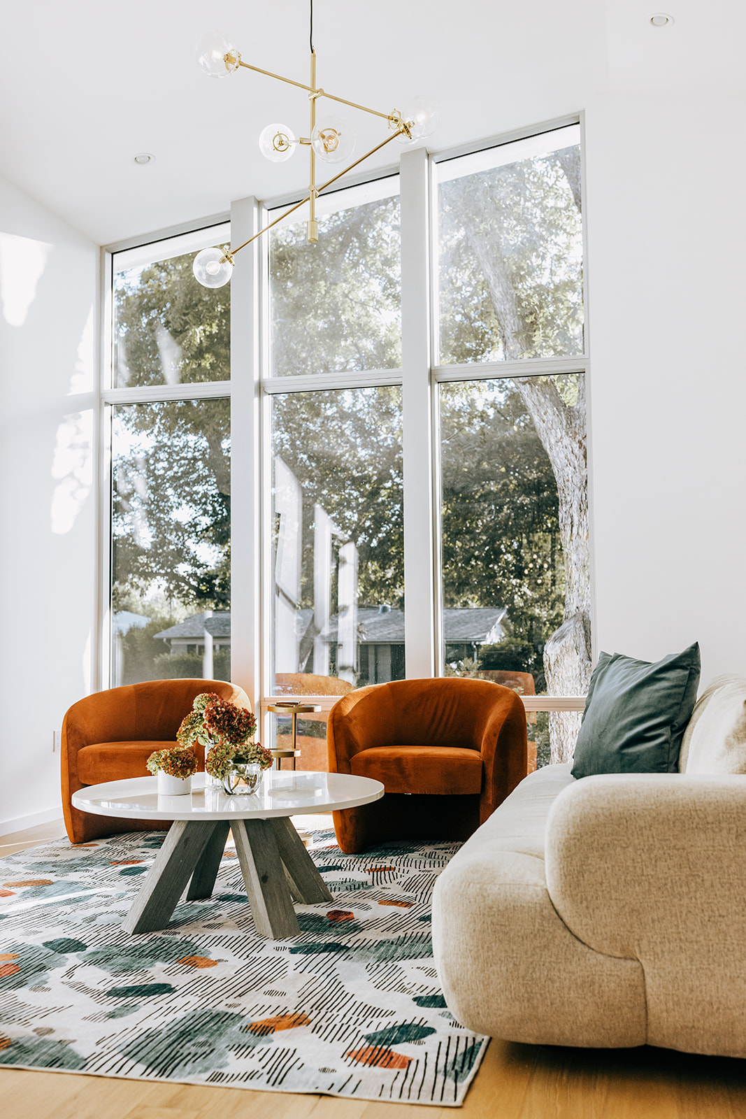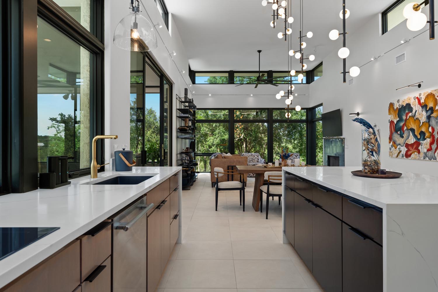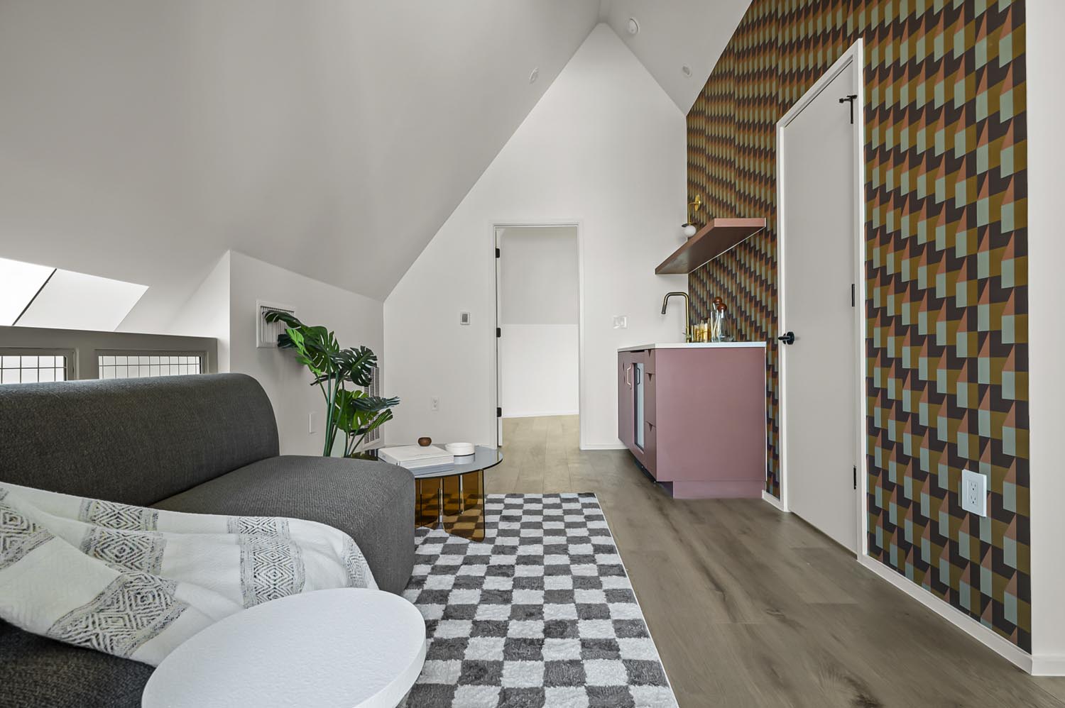 This eclectic home designed by Davey McEathron Architecture with interiors + construction by Cary Paul Studios is completely unique and custom. Step into a true architectural gem – this new construction home in the heart of Zilker blends mid-century modern charm with 70s and Memphis modern influenced interiors. Inside, you’ll find a sunken conversation pit, perfect for intimate gatherings, alongside a walnut-clad and terrazzo topped mid-century kitchen peninsula accented by mod floating shelves and warm brick details with a retro planter box.