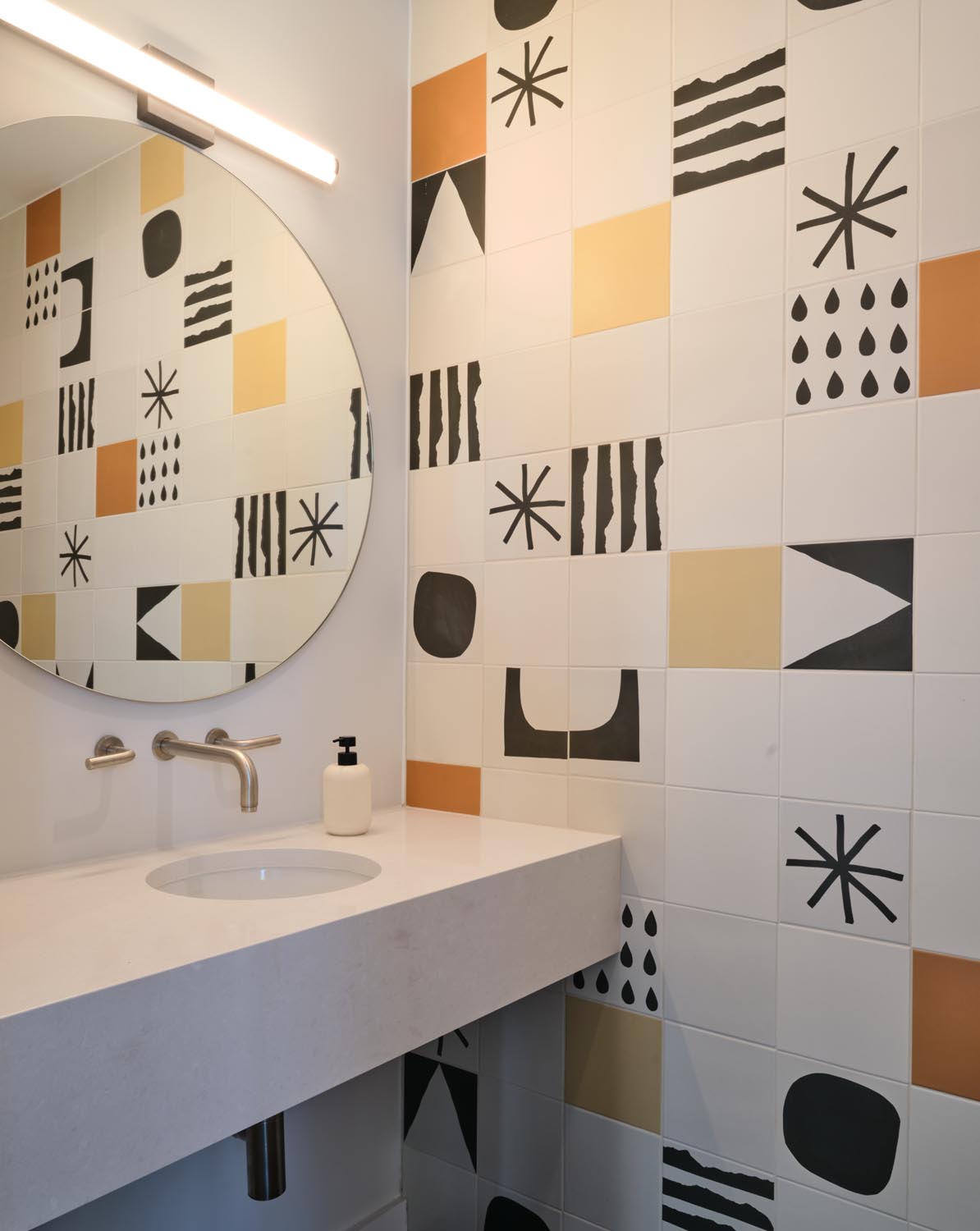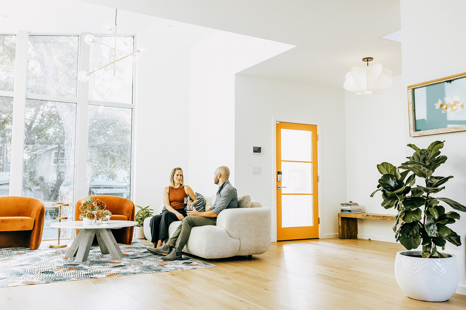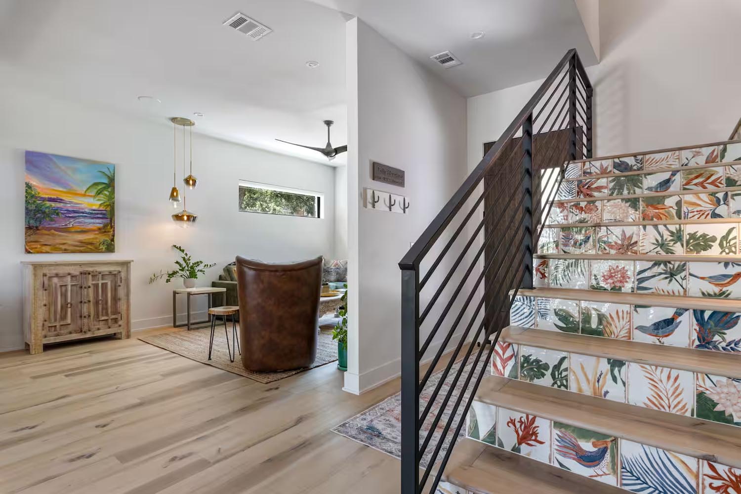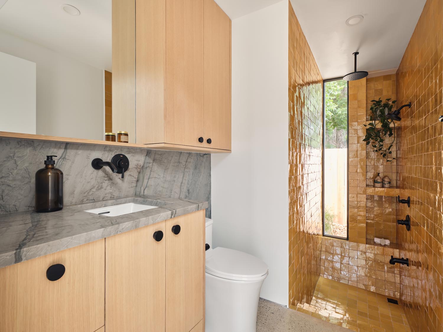This eclectic home designed by Davey McEathron Architecture with interiors + construction by Cary Paul Studios is completely unique and custom. Step into a true architectural gem – this new construction home in the heart of Zilker blends mid-century modern charm with 70s and Memphis modern influenced interiors. Inside, you’ll find a sunken conversation pit, perfect for intimate gatherings, alongside a walnut-clad and terrazzo topped mid-century kitchen peninsula accented by mod floating shelves and warm brick details with a retro planter box.