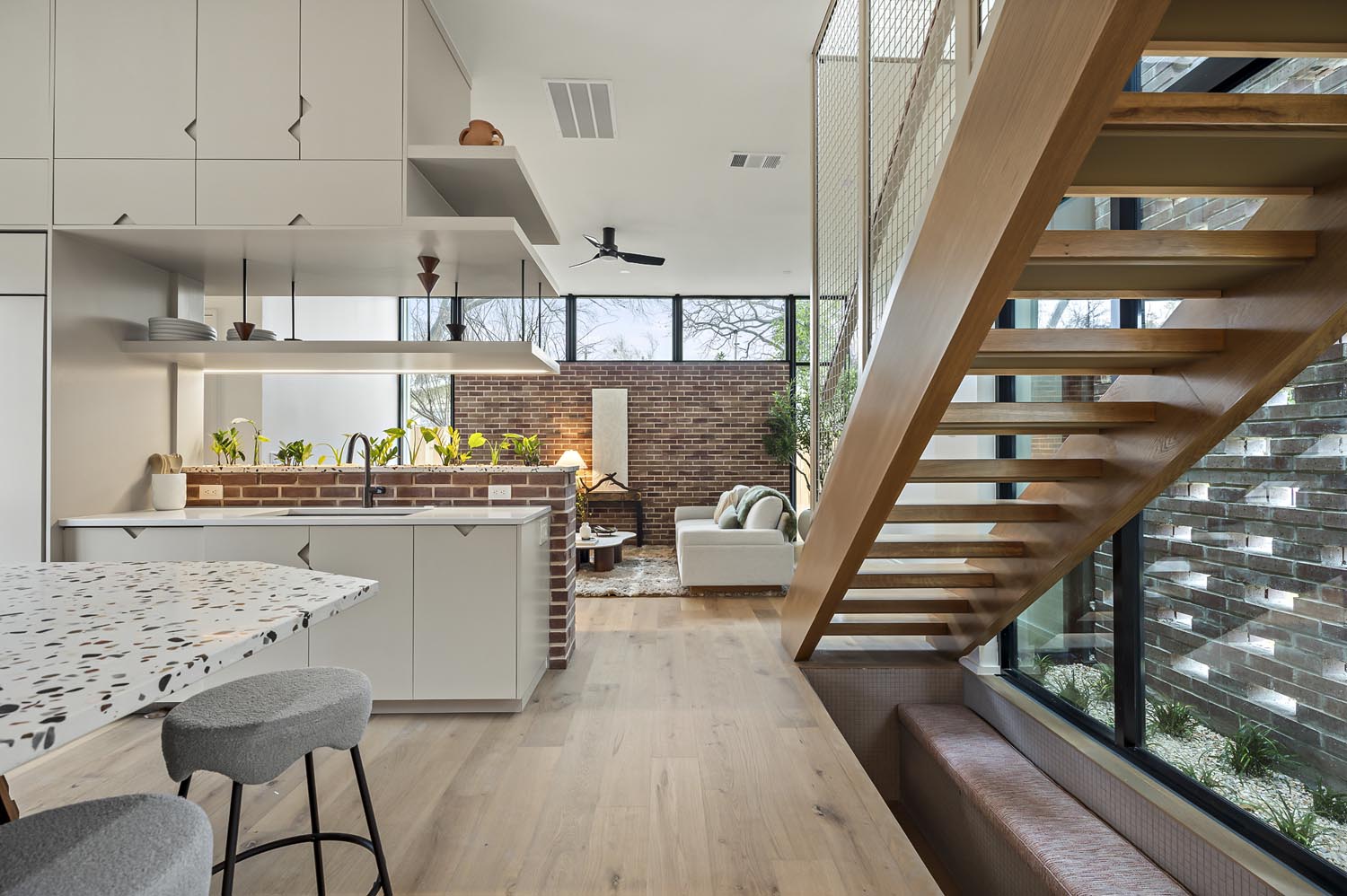 Nestled in the heart of Barton Hills, this home was designed to cultivate openness, light and connection to its natural surroundings. The design explores the relationship between interior and exterior, inviting natural light deep into the space while framing views of the surrounding landscape. The use of brick and large windows blurs the threshold between house and garden, allowing the the landscape to feel like a true extension of the house.