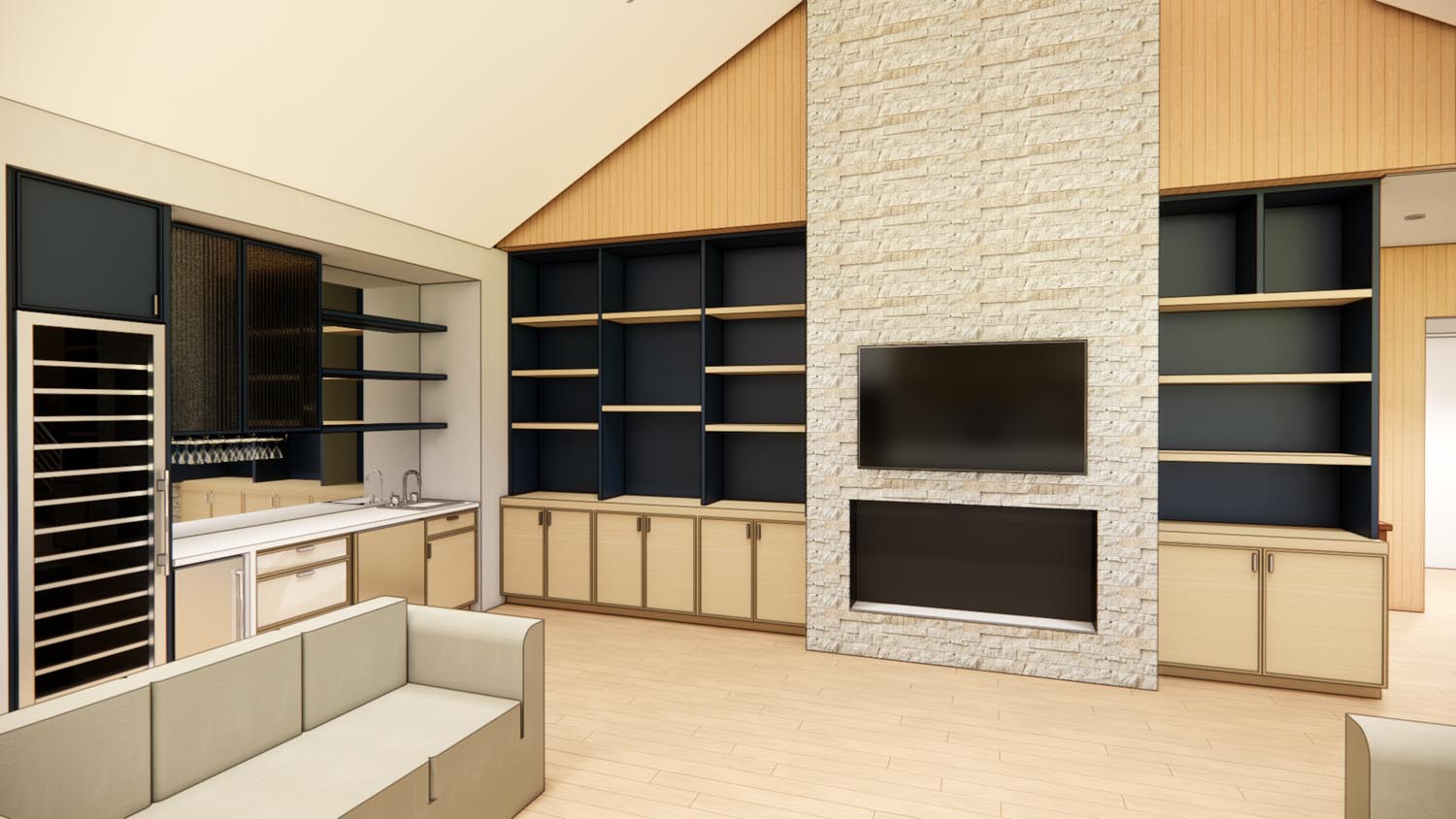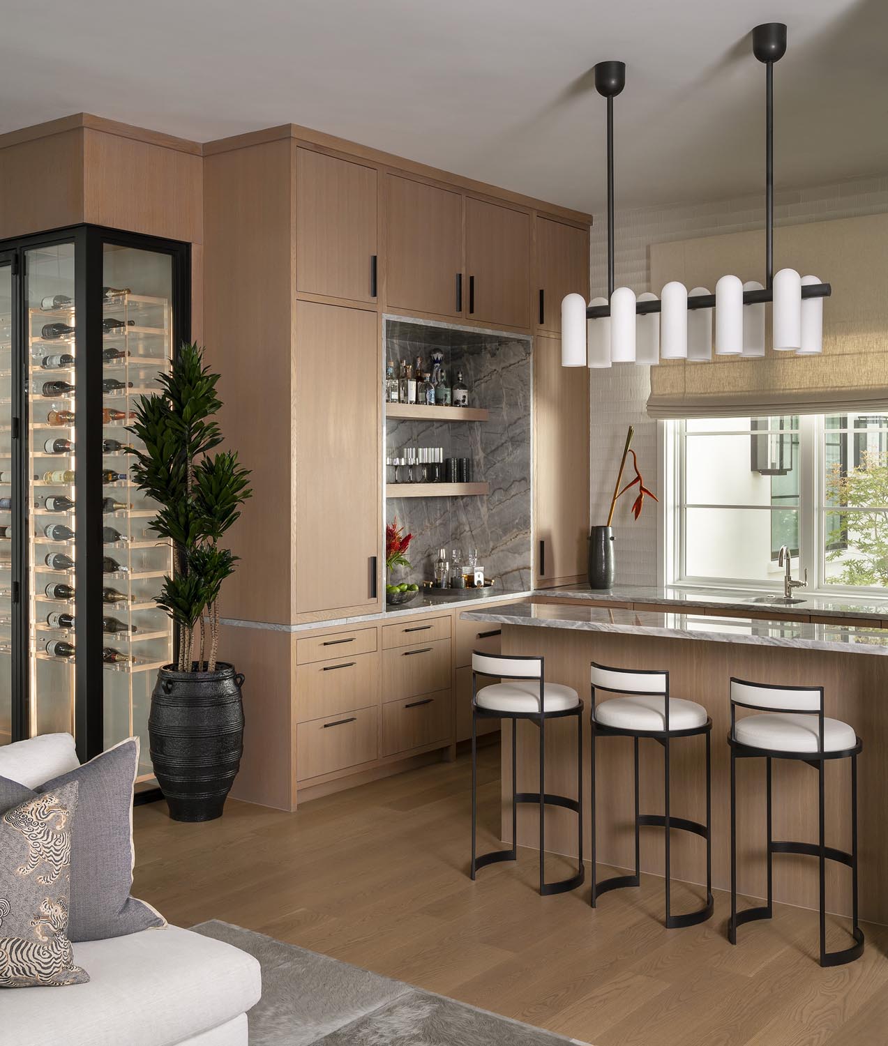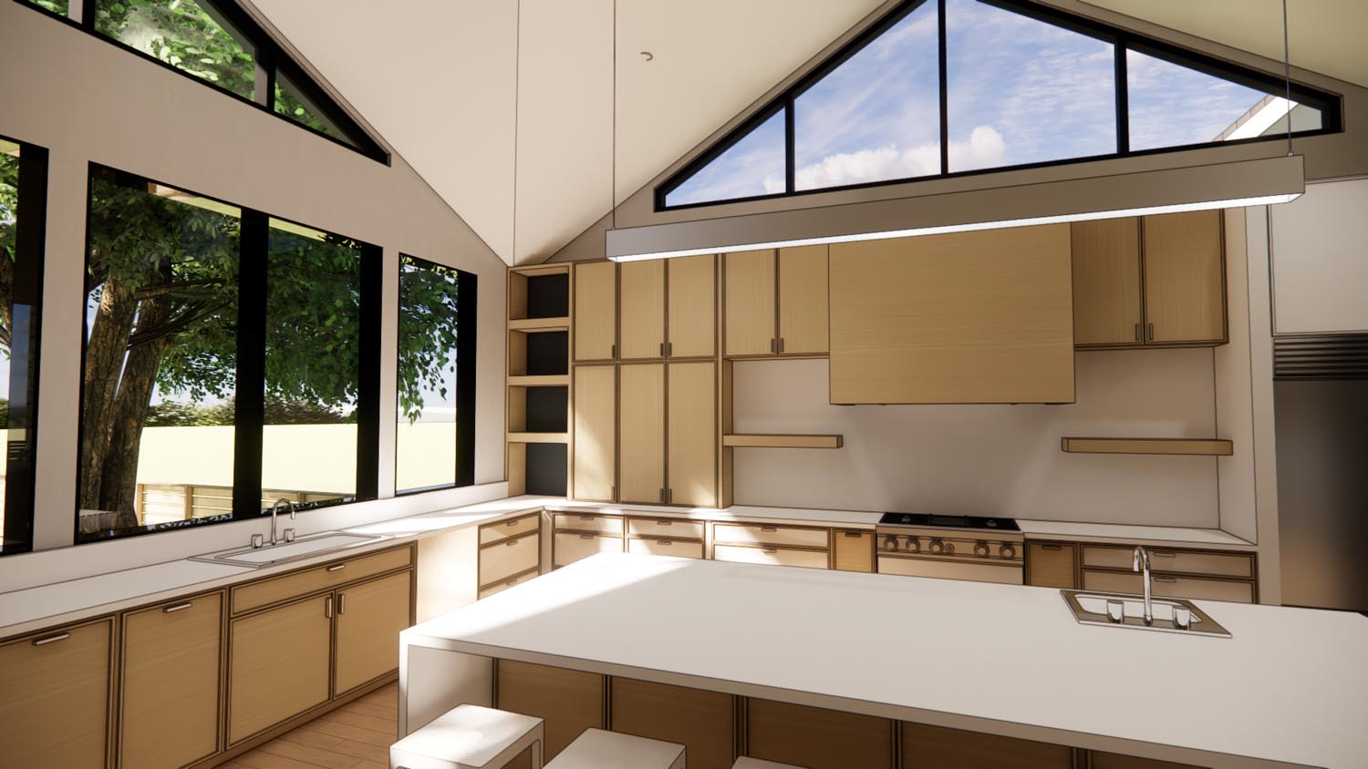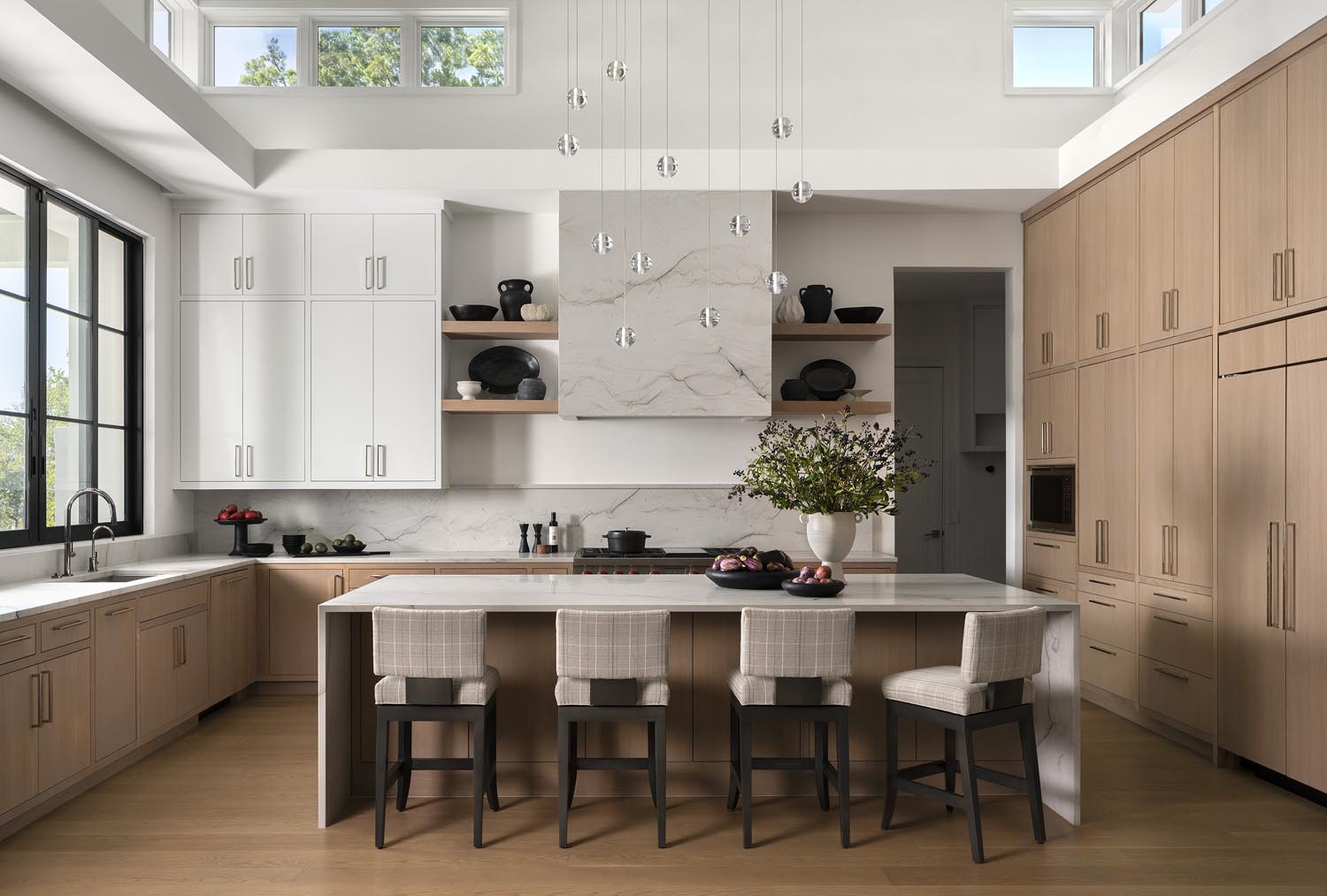 From a thoughtful blend of modern design principles and traditional features, the William Holland Residence blurs the lines between eras with its transitional charm. The homeowners seek a dwelling that feels spacious and seamless rooms blending into the outdoors in an effortless flow. In addition to the modern approach to their homes layout, they envision a composition of volumes and materials that echoes eras of the past. The form takes shape around a 40” Sycamore, rooting the home in its context beginning with the footprint that pushes and pulls intentionally. These volumetric gestures are guided by the growing family’s love of gathering and intentional storage on busy days.