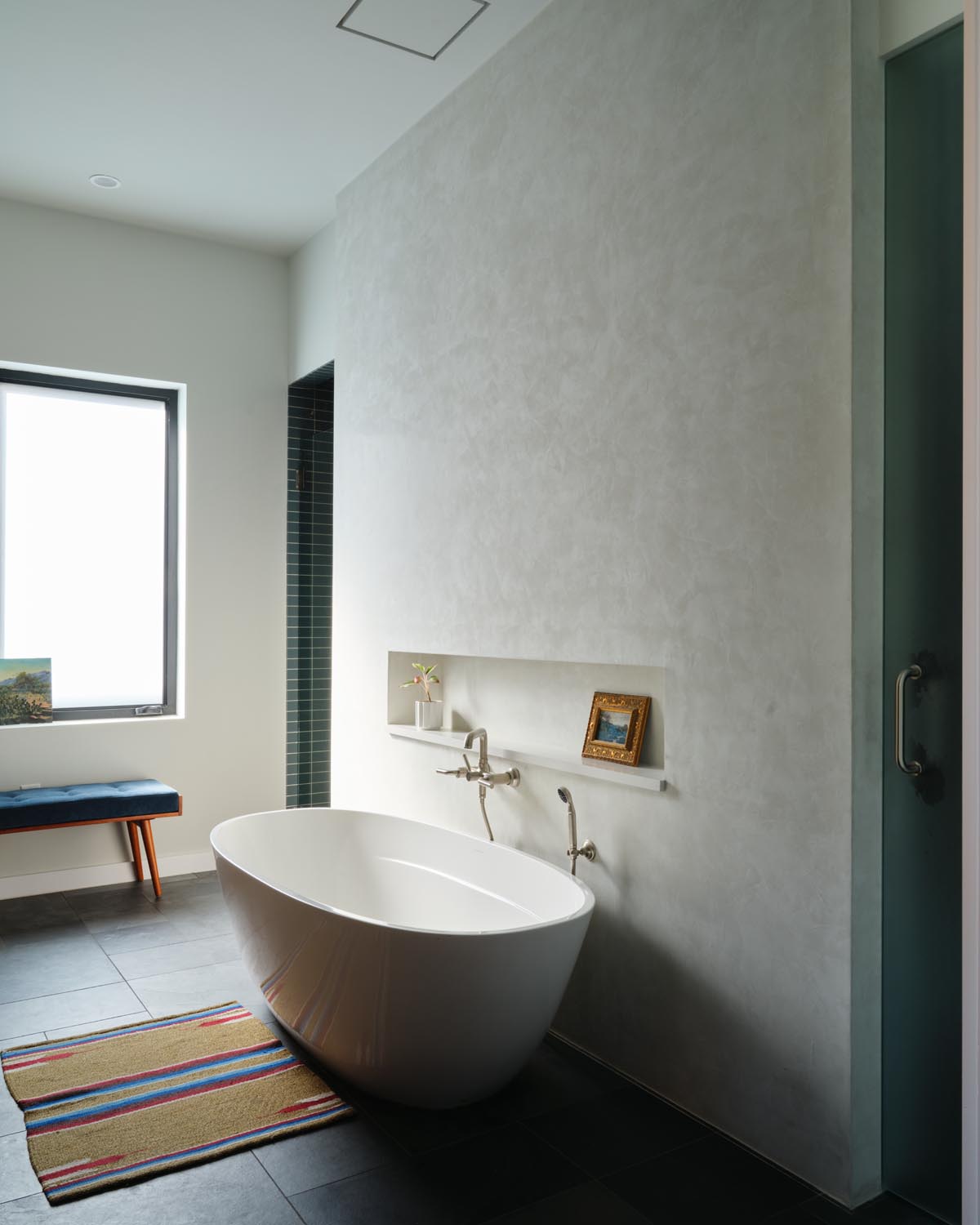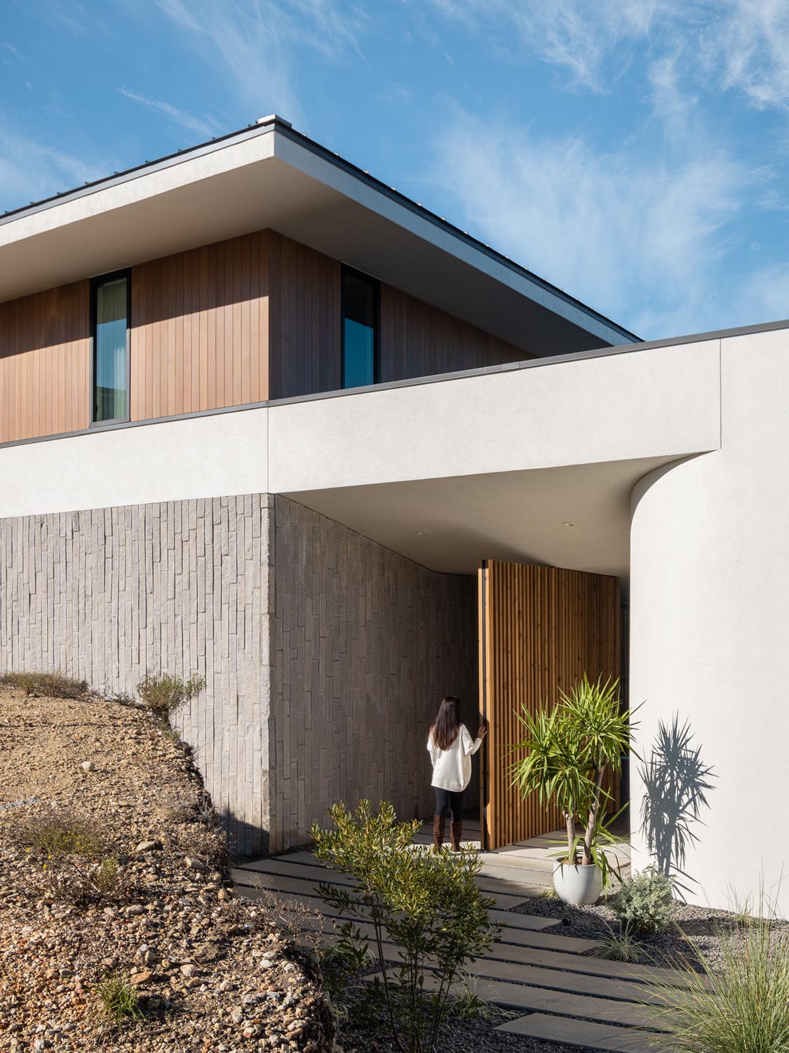 This ADU is defined by sweeping, curvilinear rammed earth walls, a unique and expressive use of an ancient building technique. These walls not only help temper the heat of the harsh Western Sun but also serve as textural and tactile elements that soften the facades with their organic curves. Crowning the structure is a barrel-vaulted roof clad in soft green metal, which curves downward to become walls—emphasizing the fluidity of the architecture and highlighting the homes’ sculptural forms.