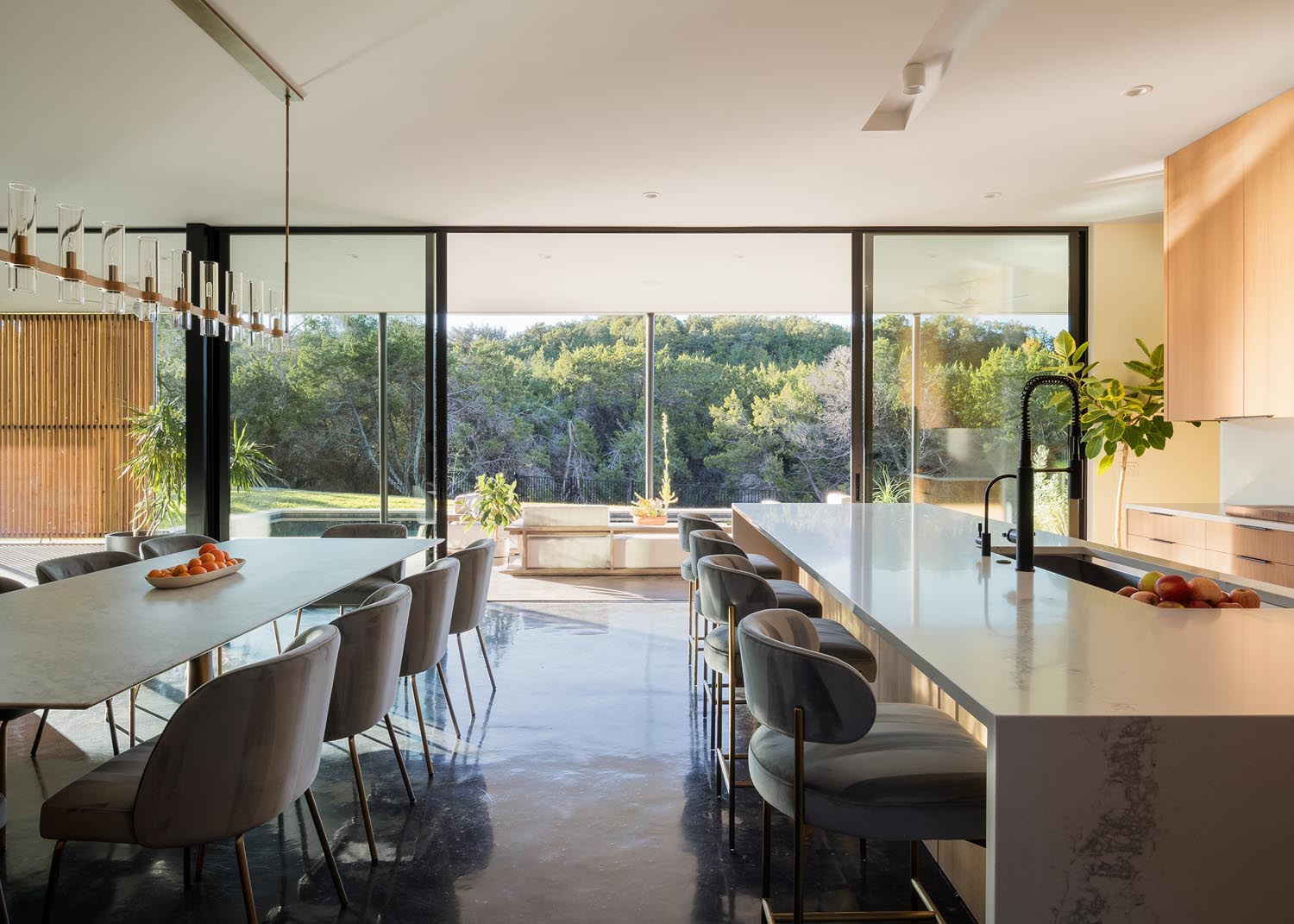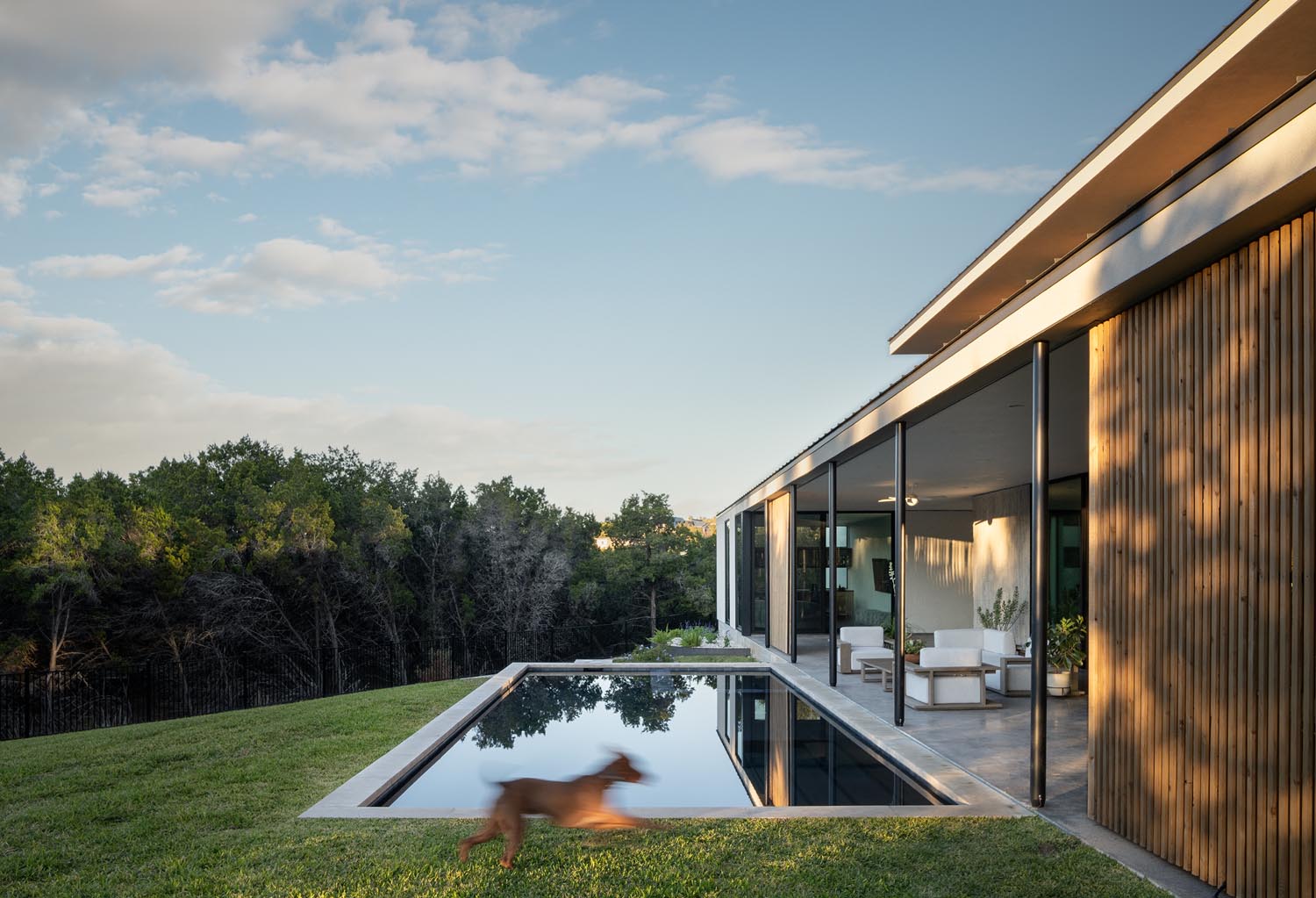 Embracing a sustainable, climate-responsive approach, the new home is modest in size yet rich in connection to the land. A central garden courtyard links the new and existing homes, maximizing opportunities for indoor/outdoor living and framing views of the pool, curated landscaping, and Hill Country beyond.