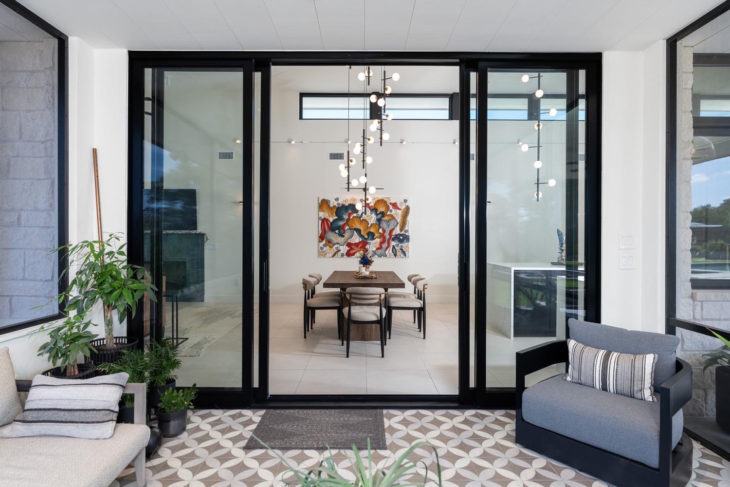 From the street, only the upper level is visible, allowing the house to recede into the terrain as one begins a downward procession toward the main living level. This sequence creates the opportunity for a courtyard-oriented home. Rather than a conventional front door, arrival is marked by a front gate that leads beneath a canopy and into a series of interconnected spaces. From this point, one may enter the great room, remain on the outdoor patio, move directly to the pool deck, or access the enclosed game room adjacent to the pool. These shared areas are visually connected, offering guests a clear understanding of the home’s spatial organization and its relationship to the landscape.