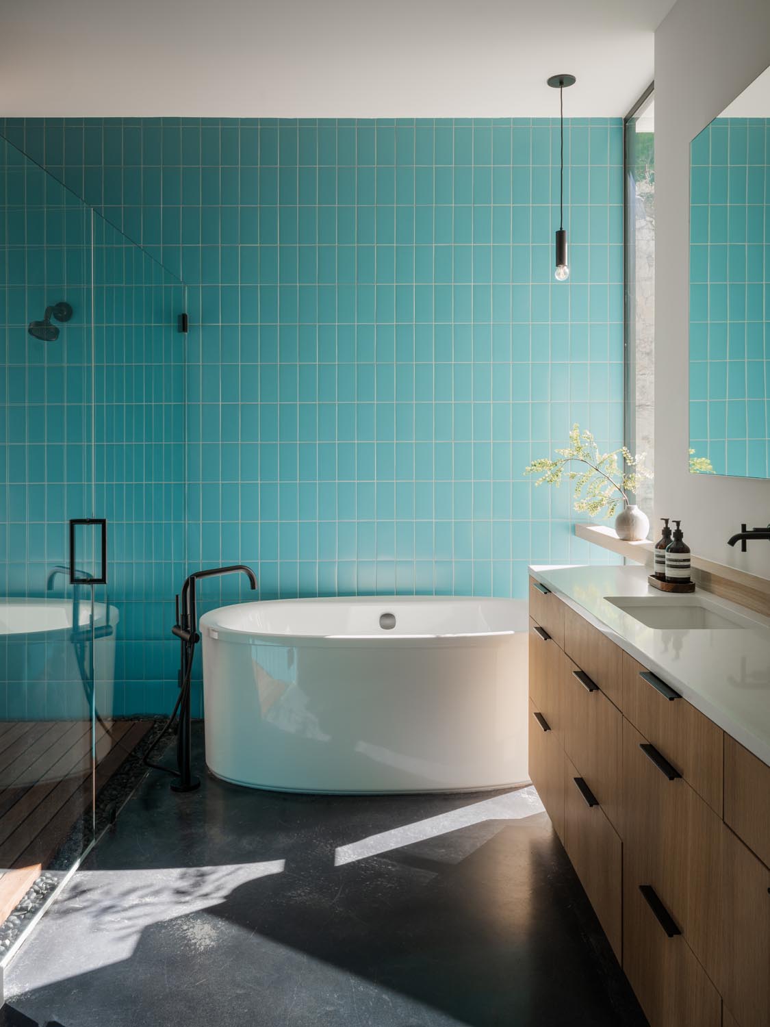 The house is defined by two distinct wings connected by a glass passageway. The north wing contains the main public spaces where a more expressive play of materials creates richness and texture. Every vantage point offers a visual connection to the outdoors, reinforcing the home’s dialogue with nature. The south wing is comprised of the more private programs, including the master suite and a second floor with additional bedrooms, offering moments of retreat and quiet. This simplified form contrasts with the material dynamism of the north wing, creating a deliberate balance between openness and repose.
