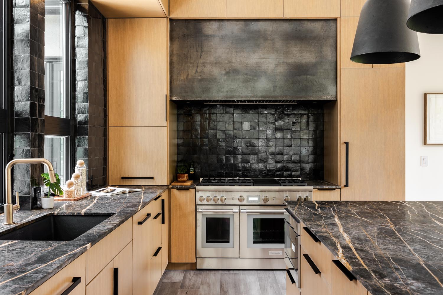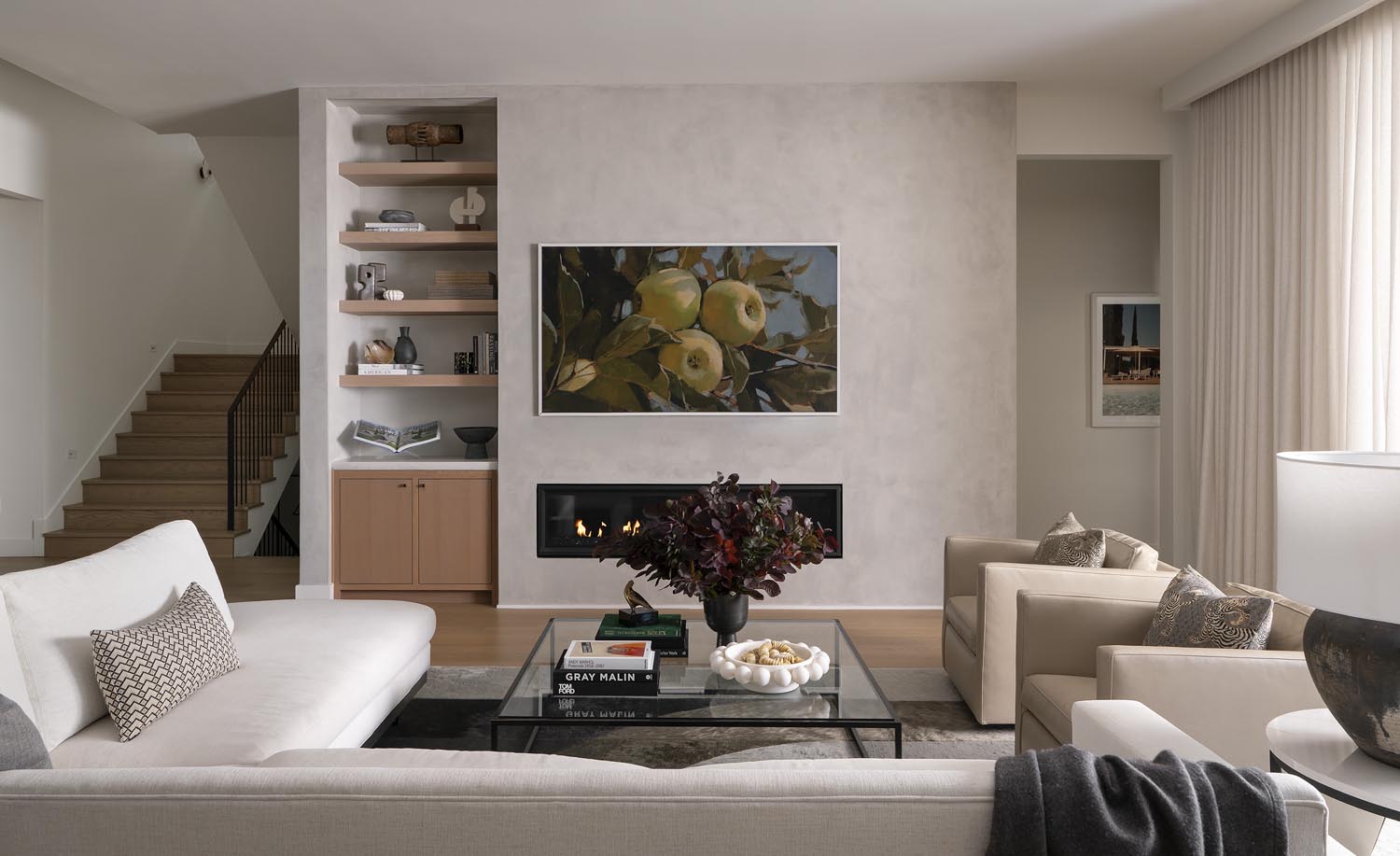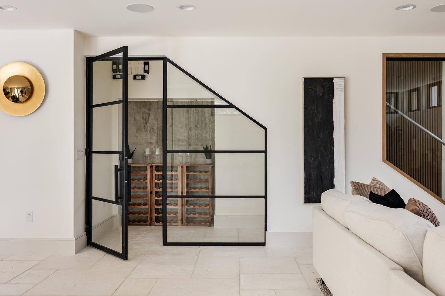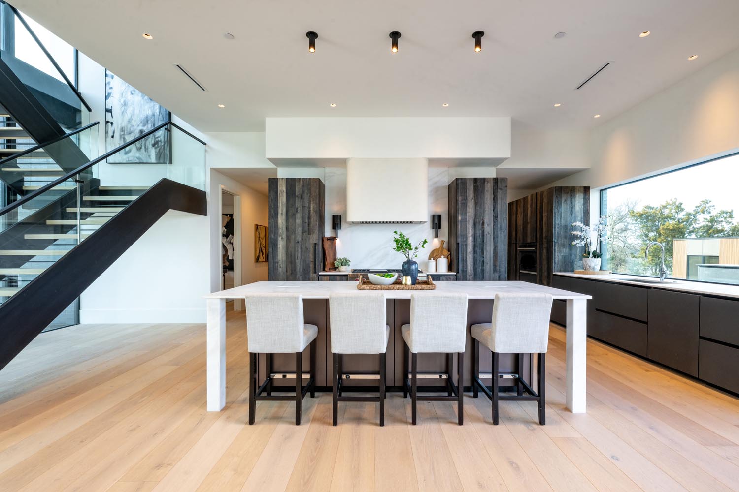 Inside, the interiors are a warm and tactile blend of natural finishes: white oak cabinetry, terracotta, marble, and troweled limewash. The polished concrete floors have been honed to reveal a terrazzo-like finish, adding texture and durability underfoot. Throughout the property, custom steelwork and intricate detailing—such as hand-forged railings, thresholds and shelving — elevate the design to a truly artisanal level.