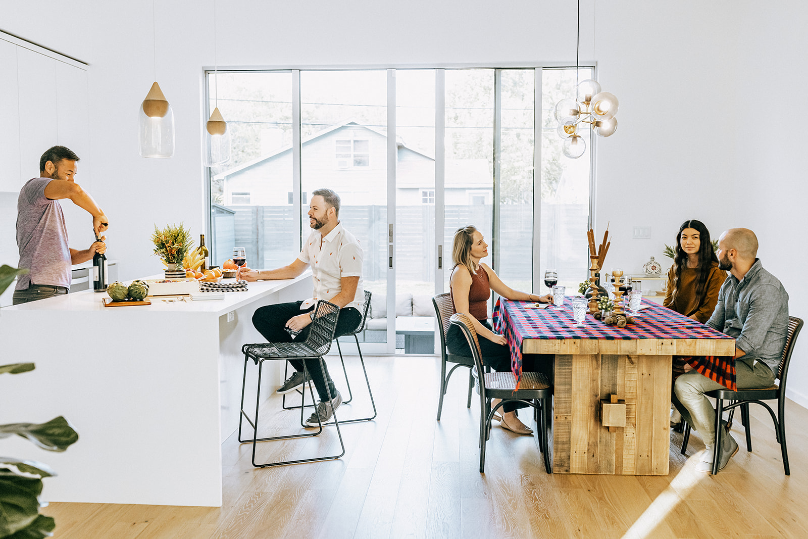 The new house sits on a raised pier-and-beam foundation driven by floodplain requirements. The challenge was making that elevation feel natural in a neighborhood defined by low-slung, slab-on-grade homes. The solution was restraint: a simplified form, low rooflines, and careful proportions that allow the house to echo its context rather than contrast drastically from it. Inside, the clients wanted the home to feel as effortless as their favorite boutique hotels—bright, calm, and intentional— oriented to outdoor living a la a Palm Springs–inspired design. Budget priorities focused energy on what matters most: an entertainer’s kitchen, wood floors, tall floor-to-ceiling windows, and vaulted spaces. The result is a light-filled, modern home that feels easy, composed, and quietly confident—proof that constraints can sharpen clarity rather than limit possibility.