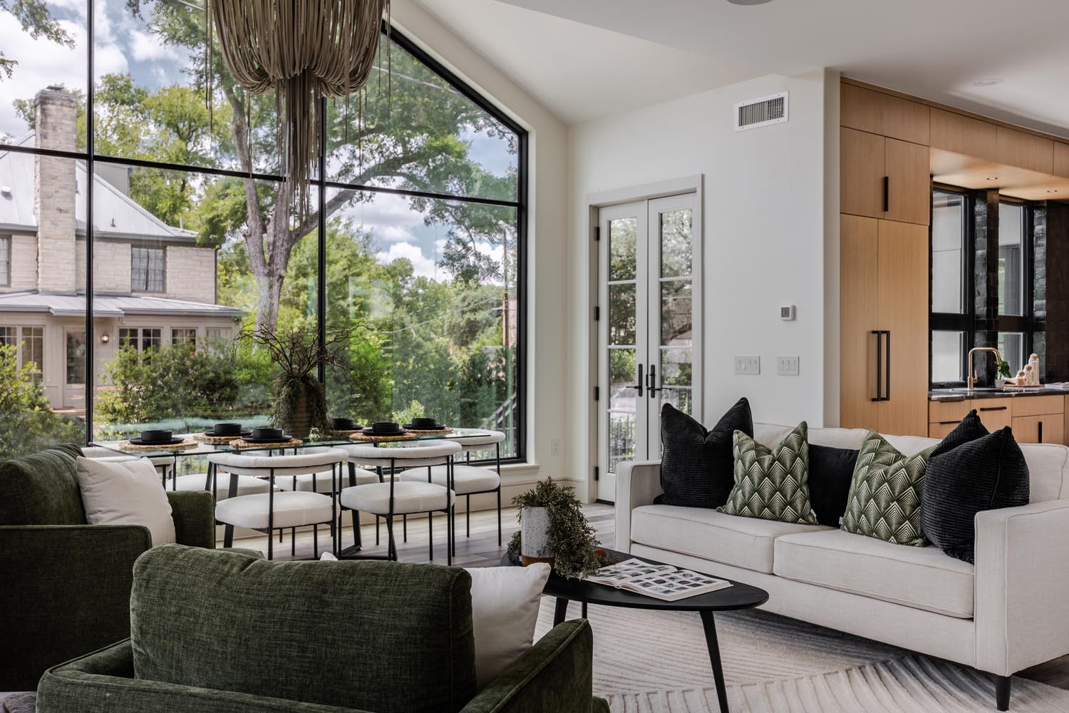 The residence is entered through a wallpapered foyer that opens dramatically to the soaring Living Room beneath a cross-vaulted ceiling. The homeowners love a gabled roof, and the gesture of doubling and rotating a gable 90 degrees maximized the natural light and high-ceiling experience while maintaining a human scale. This infused a character into the home that pushed beyond modern and traditional and feels one-of-a-kind. Triangular clerestory windows in every direction brought the surrounding greenery indoors without overwhelming the home’s period details and personal adornments. The home explores textures and patterns in each space, creating moody atmospheres and playful vitality. To walk through the William Holland Residence is to journey through a personal emulsion of old and new, responding to the lives the homeowners live.