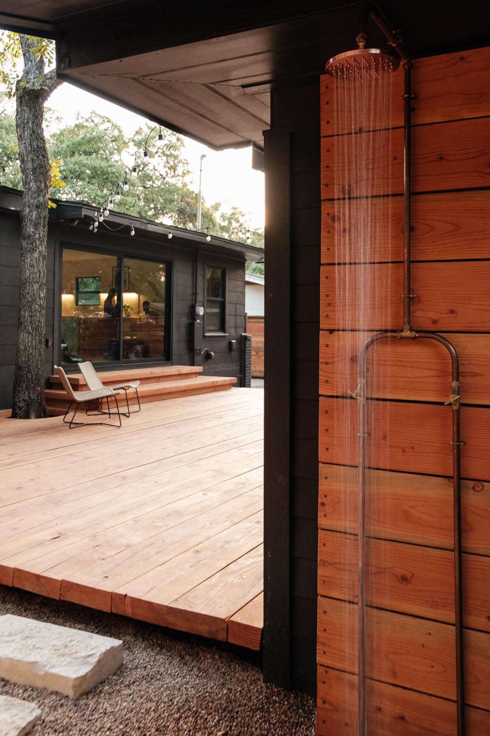 The layout unfolds as a series of experiential spaces. Mature pecan trees support a suspended tree net, a brass outdoor shower and a hidden firepit tucked just out of sight from the pool introduce moments of discovery and retreat, reinforcing the layered character of the space.