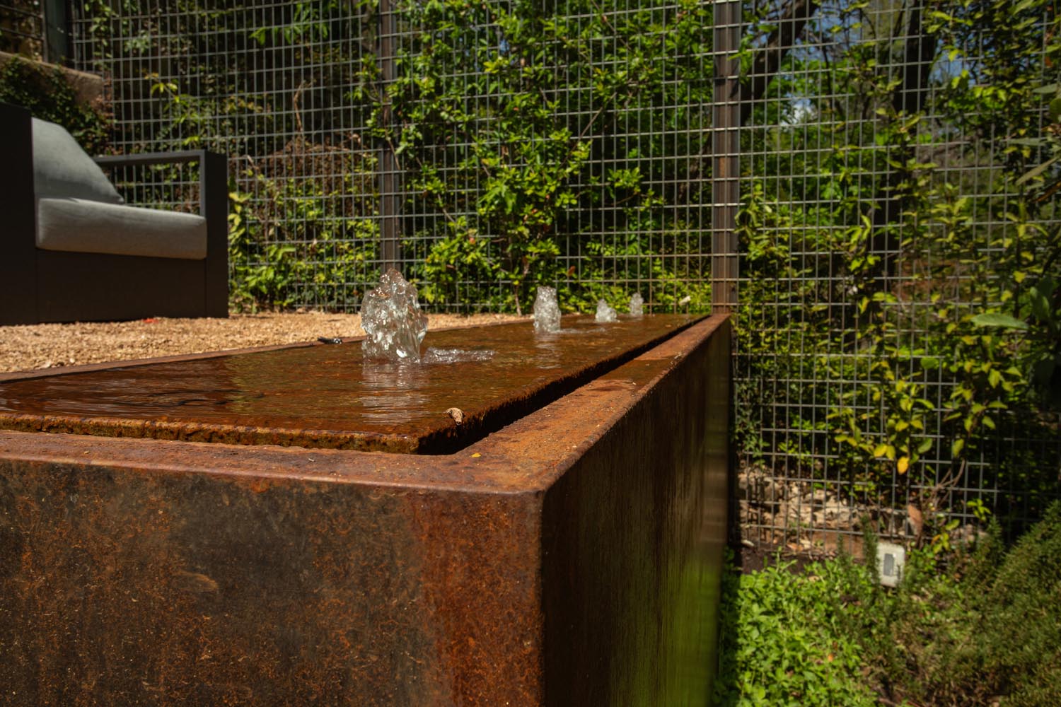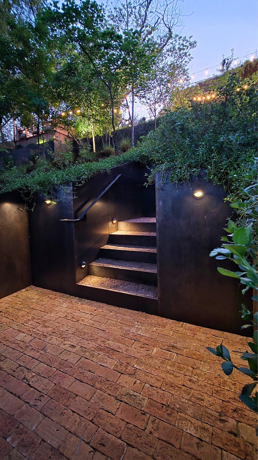 This project showcases extensive steelwork, including long trellises, retaining walls, and carefully crafted landscape steps, all thoughtfully integrated into a hillside setting.