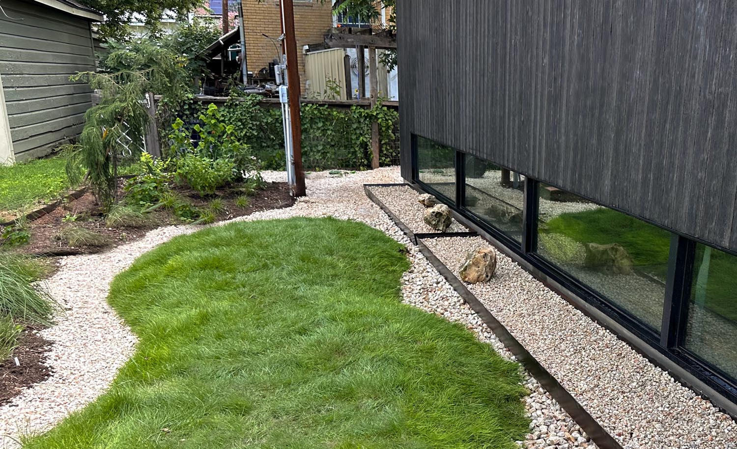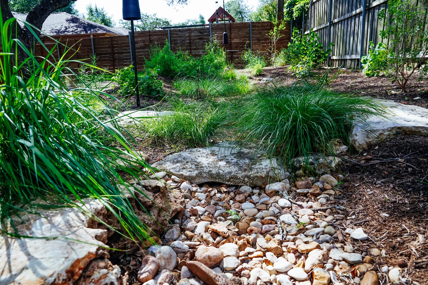 Set within a quiet residential pocket of Northwest Austin, this understated rain garden transforms a narrow side yard into a functional and ecologically rich landscape feature.