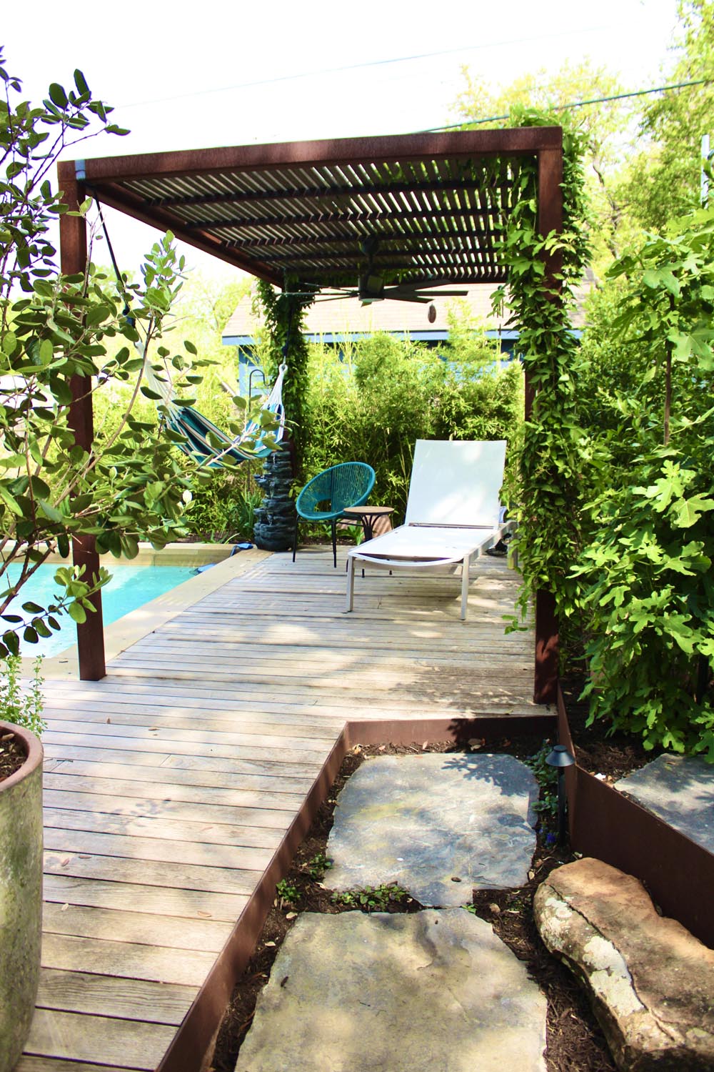 The pool itself is not decked on all four sides. Instead, one edge dissolves into a lush xeric garden while another is softened by grasses and vines that spill gently into the pathway.