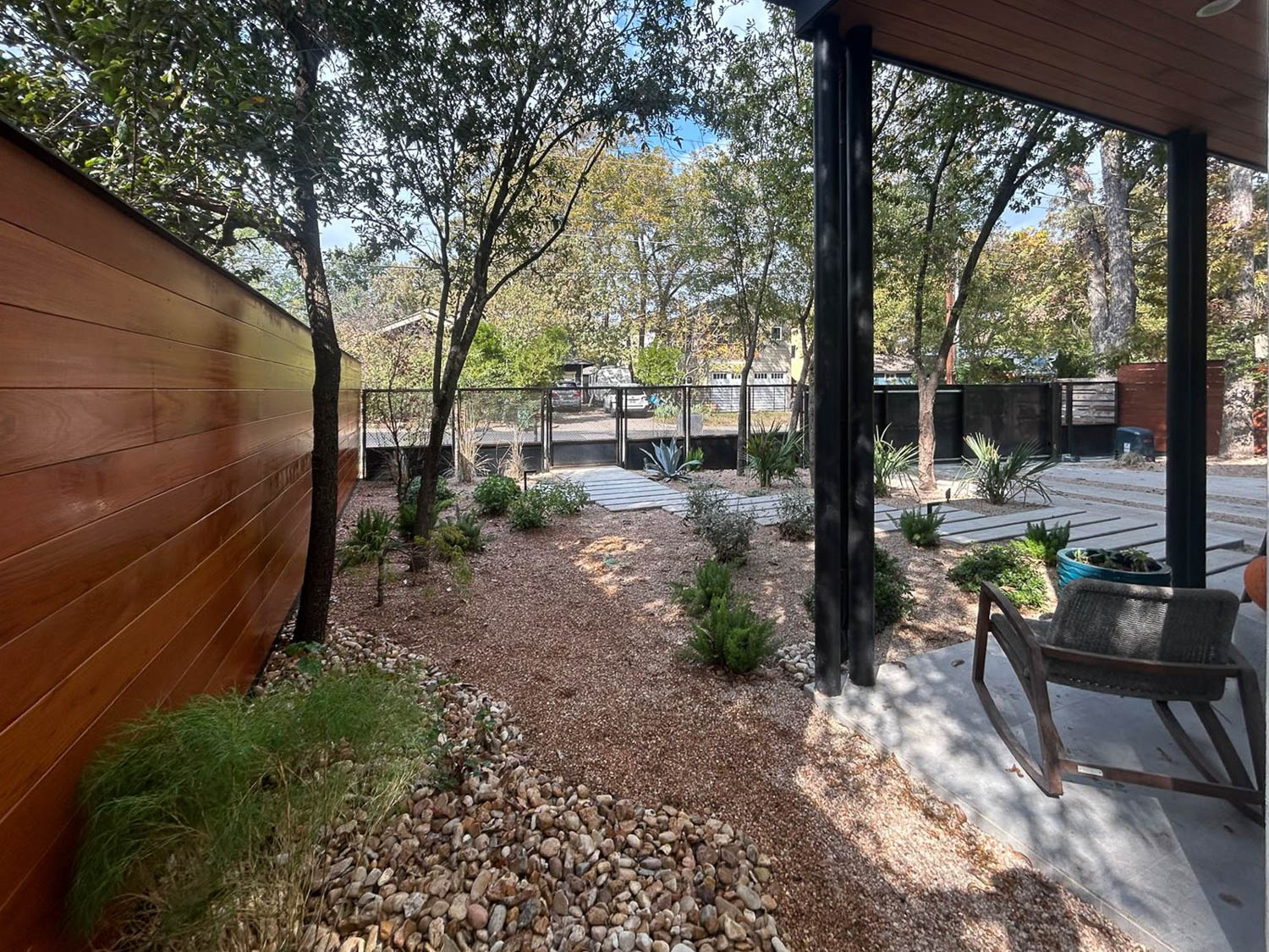 As the garden matures, it will continue to knit into the surrounding tree canopy, offering a low-maintenance, drought-tolerant solution that reflects the character and climate of Central Texas living.